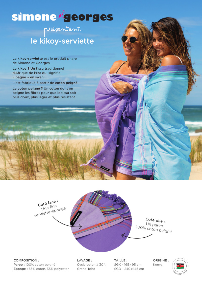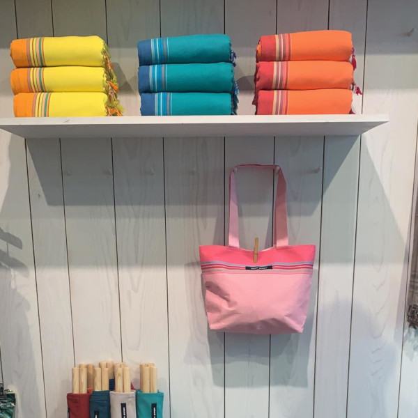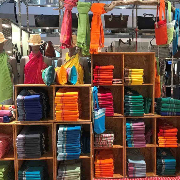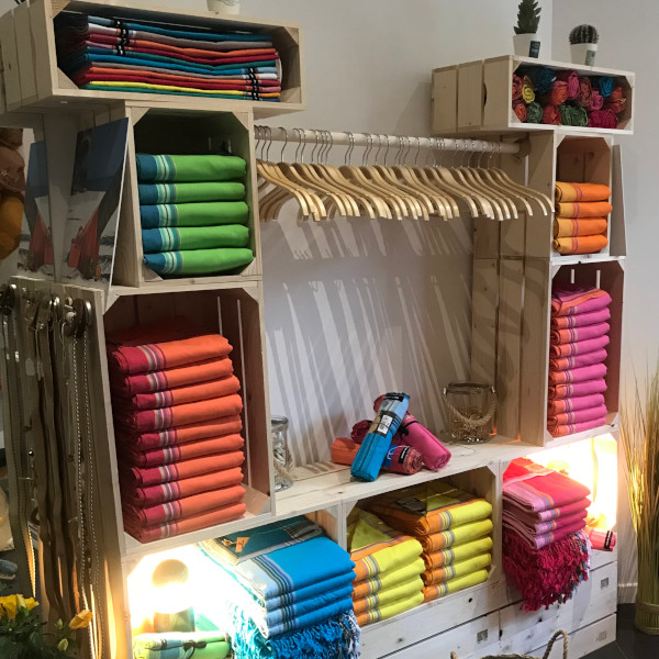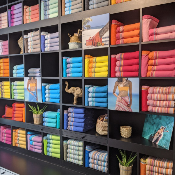 Le plus simple pour présenter vos Kikoy-serviettes c'est de remplir une grande étagère en mettant dans chaque case un coloris avec 5 exemplaires empilés. Petite astuce : repliez-en un côté éponge pour que vos clients puissent voir le coloris sans avoir à le déplier.